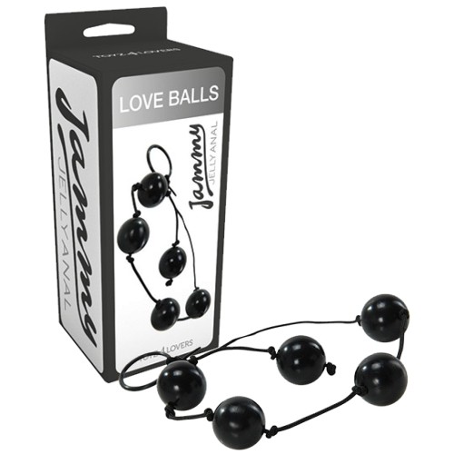 As LOVE BALLS da linha JAMMY JELLY ANAL são compostas por 5 bolas anais com um desenho muito elegante, unidas por uma corda muito fina e suave. A pega em forma de anel é muito prática, e o seu formato permite uma penetração fácil e segura. Estas bolas são ideais para o prazer anal, mas também podem ser inseridas na vagina. As bolas são impermeáveis e livres de ftalatos.