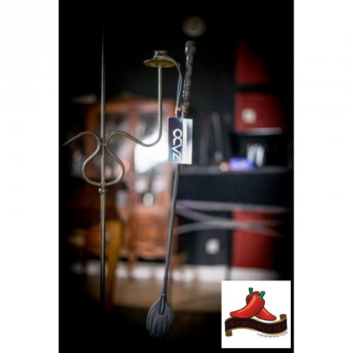 Colher de silicone preta com cabo metálico pendurada num suporte