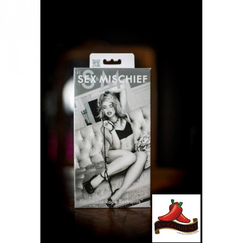 Embalagem produto 'SEX MISCHIEF' com foto mulher em roupa íntima preta sentada em sofá