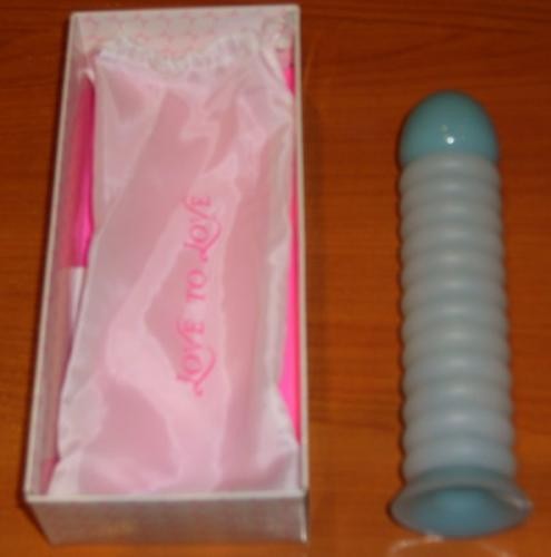 Objeto cilíndrico cinza claro com base azulada ao lado de uma caixa com saco rosa satinada com inscrição 'LOVE TO LOVE'