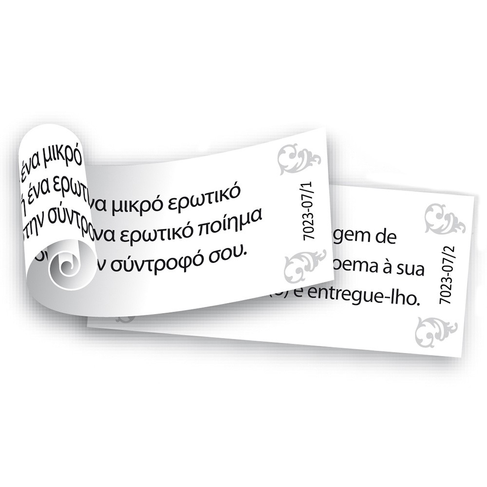 DESCRIÇÃO: Mais de 100 desafios repletos de romance!Peça ao seu parceiro para tocar a sua canção romântica preferida. Faça um trilho de pétalas de rosa ou acenda velas que conduzam o seu parceiro até um local onde tem uma surpresa à sua espera! Conte-lhe um sonho romântico que teve ou escreva um poema de amor. ?Coração Romântico? é um jogo ousado e entusiasmante para si e para o seu parceiro. Cada um de vocês retira à vez um rolinho de papel da caixa, usando a pinça. O que irá acontecer agora? Será um fantástico e terno momento passado em conjunto, ou uma noite de intimidade e paixão? Este presente não é comparável com qualquer outro jogo, não há limites de tempo e ambos serão vencedores. Pode usar este presente a qualquer hora do dia e será por vezes surpreendida por uma iniciativa romântica do seu parceiro. Algumas tarefas podem ser jogadas imediatamente, mas preparar uma saída romântica à noite ou a preparação de uma surpresa conduzirão a fantásticos momentos passados juntos mais tarde.Inclui: Uma pinça e mais de 100 desafios.