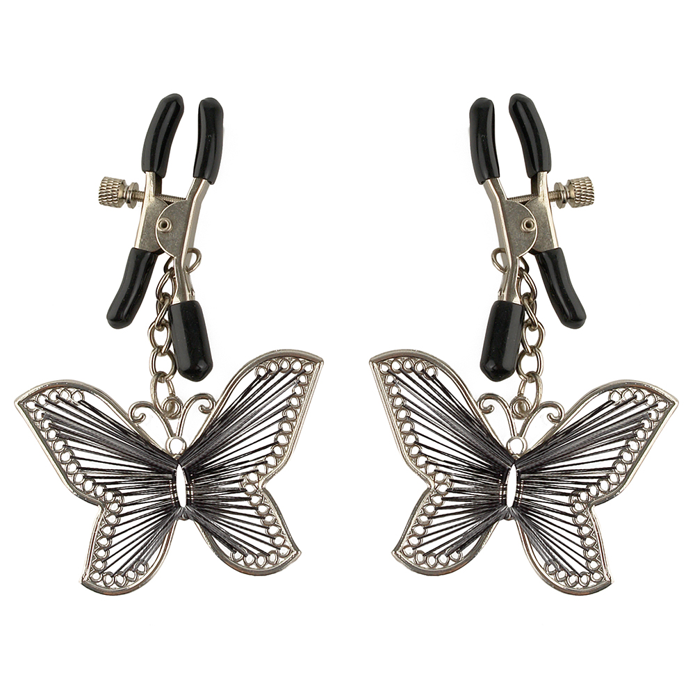 MATERIAL:Metal, PVC. DESCRIÇÃO:Elegantes e chiques, estas sensacionais pinças metálicas revestidas de borracha proporcionam sensações incríveis! Os terminais são facilmente ajustáveis graças ao parafuso, e o detalhe em forma de borboleta fará cócegas além da imaginação. Ótimas para os principiantes e os amantes de fetiche!DIMENSÕES:13 cm de comprimento. COR:Prateado e preto.