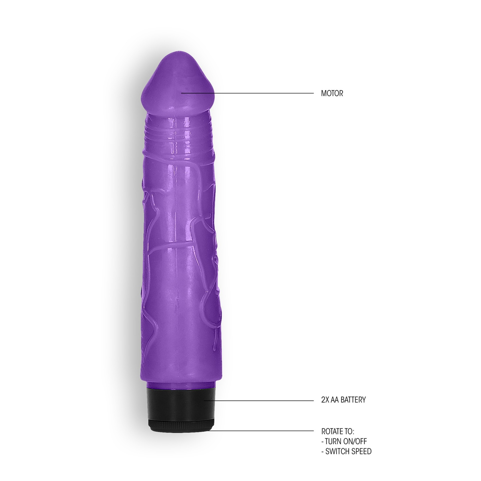 MATERIAL:TPE.DESCRIÇÃO:Com um design realista graças à glande e veias em relevo e um toque único, este vibrador adapta-se a si. Possui uma textura muito suave e a sua poderosa vibração é facilmente ajustável na base, chegando até às 11000 RPM. Bastante flexível para estimular os seus pontos mais sensíves. Apto para uso vaginal e anal. - Pilhas 2 x AA, não incluídas.DIMENSÕES:17,5 cm de comprimento; 4,2 cm de diâmetro. (Inseríveis)COR:Roxo.