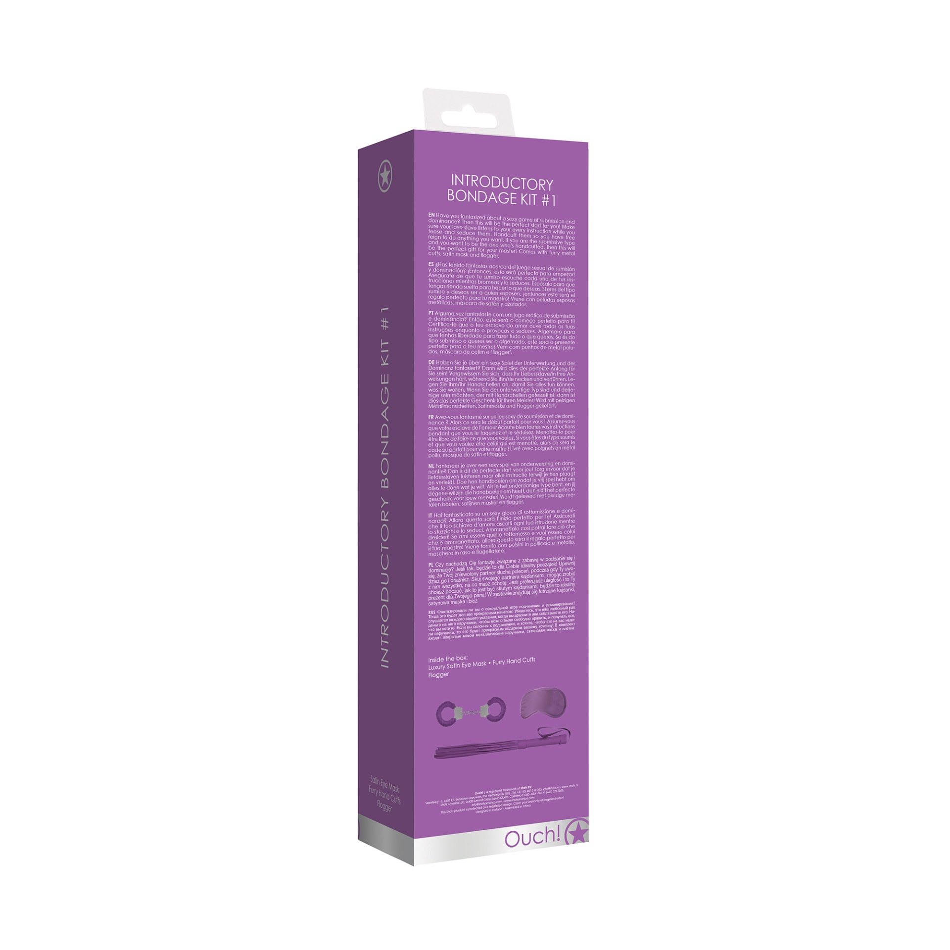 Embalagem roxa de kit de bondage com imagem de casal e texto INTRODUCTORY BONDAGE KIT #1