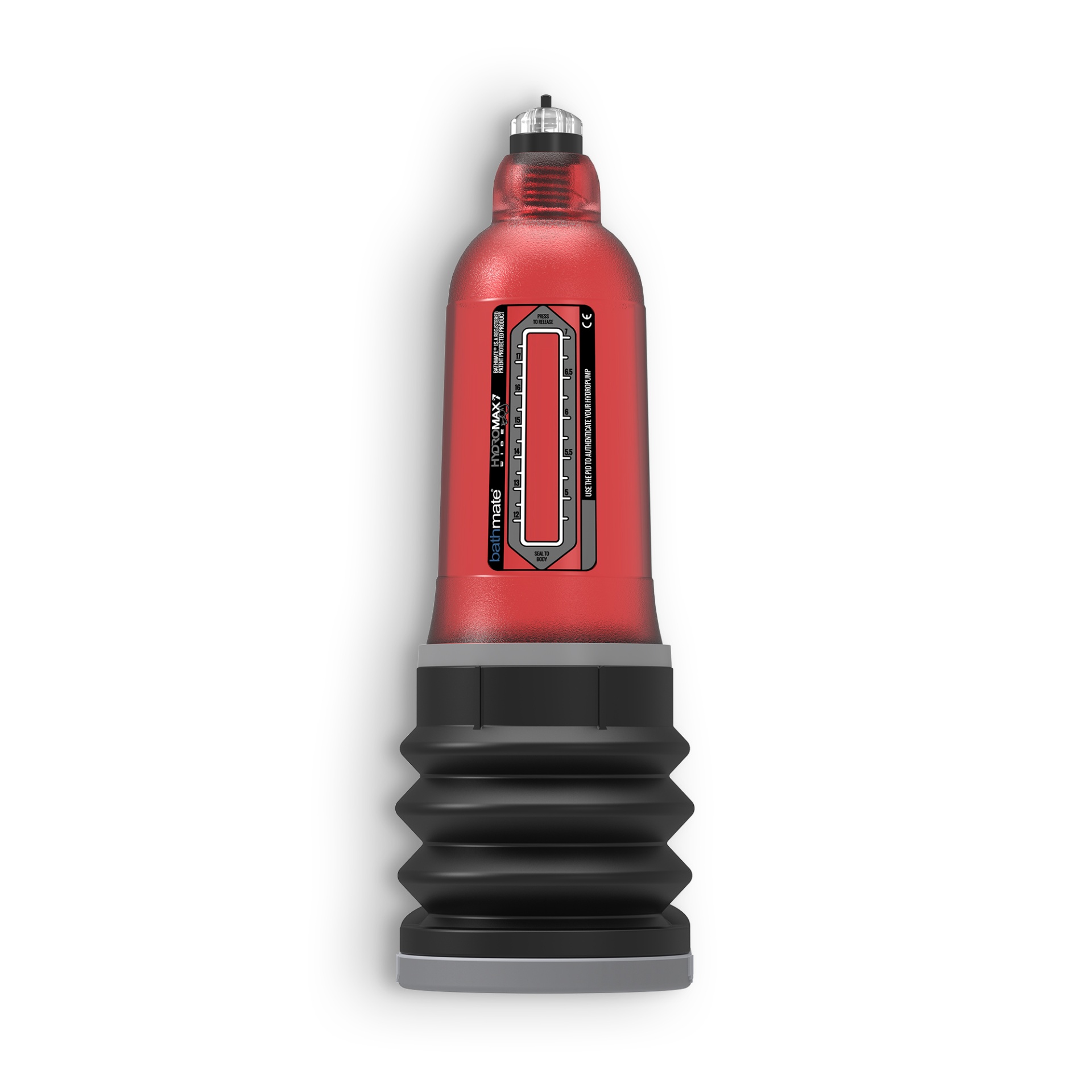 Dispositivo vermelho translúcido com base preta para aumento masculino em embalagem preta com texto Bathmate Hydromax7