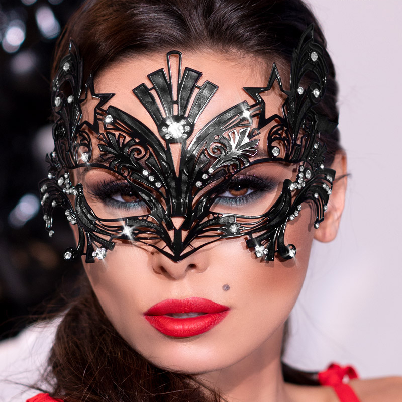 Máscara de filigrana em metal preto, anatómica e flexível, embelezada por cristais de strass. Ata por trás com fitas de cetim pretas.Produto de alta qualidade embalado em uma elegante caixa.Composição: 100% Metal.