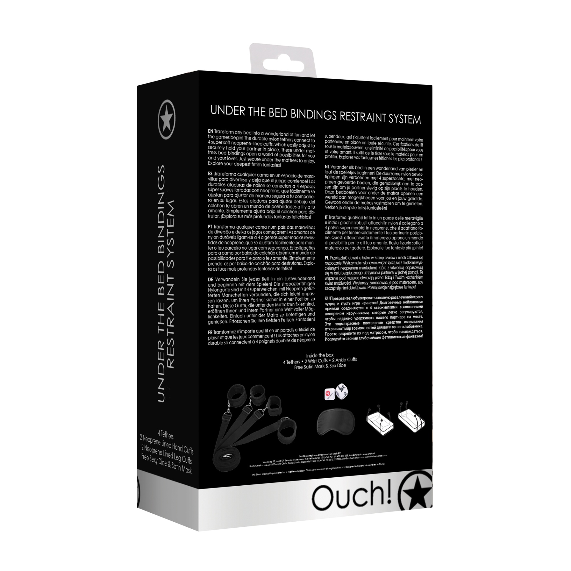 Transforme qualquer cama no país das maravilhas da diversão e deixe os jogos começarem! As amarras de nylon duráveis conectam-se a 4 algemas forradas a neopreno super macio, que se ajustam facilmente para manter o seu parceiro no lugar com segurança. Os atilhos para debaixo do colchão abrem um mundo de possibilidades para si e para o seu amante. Basta colocar debaixo do colchão para desfrutar. Explore as suas fantasias fetichistas mais profundas!Material: Plástico, Neopreno, Cetim.