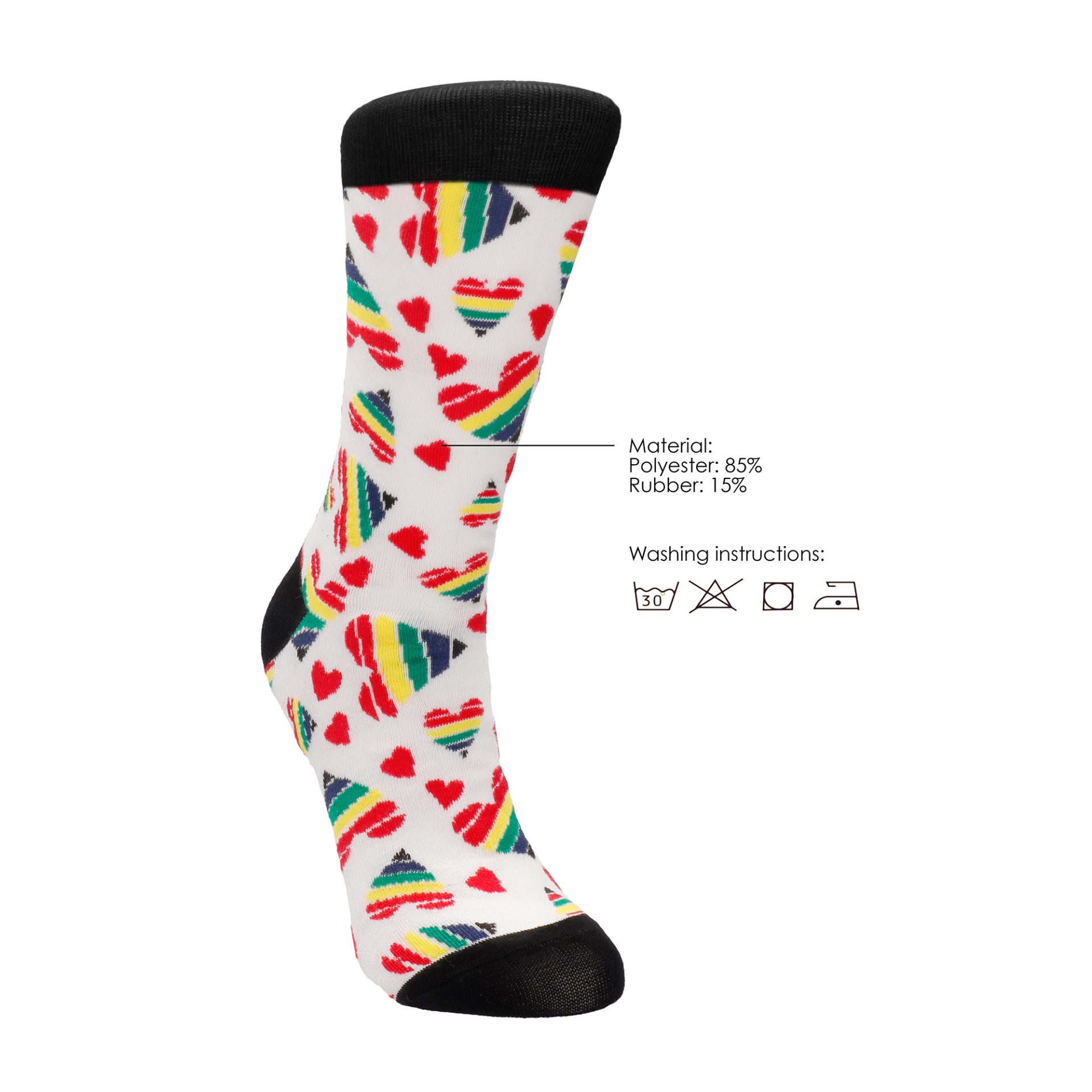 Meia branca com corações coloridos e detalhes pretos