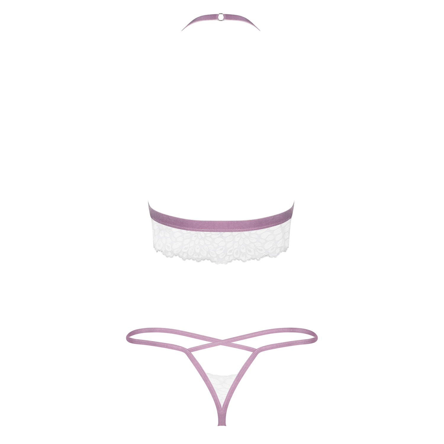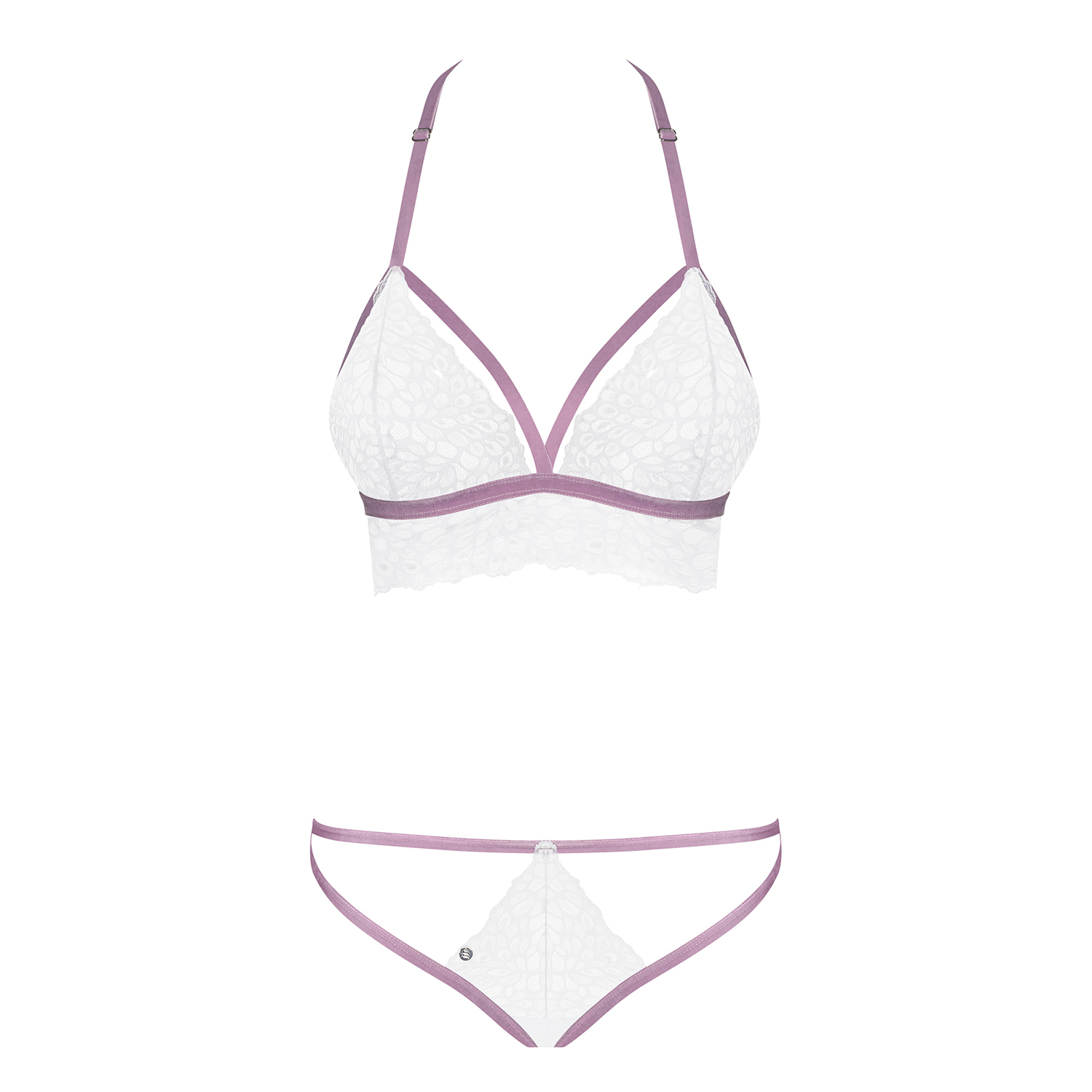Este conjunto desperta os sentidos! Corte e tiras sensuais e renda elegante, tudo em branco acompanhado de lilás. Este conjunto translúcido irá dar a volta à sua cabeça! O formato magnífico dos peitos e o ajuste perfeito estarão garantidos por uma tira ajustável usada à volta do pescoço. O material extensível e as tiras elásticas garantem um grande conforto.Descubra todos os detalhes:- conjunto Lilyanne branco- tira ajustável à volta do pescoço- ligas elásticas no busto e ancas - realçam perfeitamente as formas sensuais- copas com renda macia semi-transparente - seios em destaque- renda com padrão adorável com ligas lilás- as alças são feitas de tecido aveludado- tanga de cintura alta - aspeto perfeito do rabo- itens do conjunto: sutiã e tanga- material delicado com boa elasticidade (90% poliamida, 10% elastano)