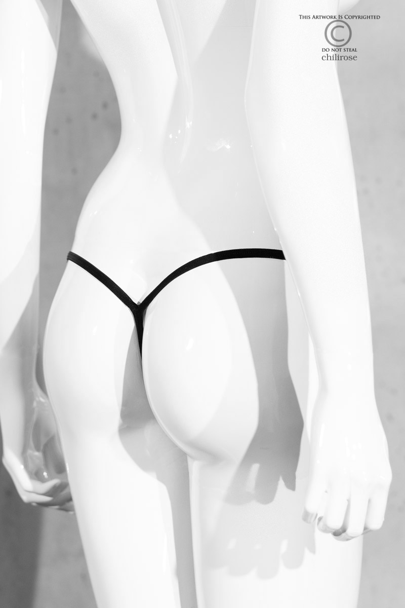 Manequim branco de costas usando tanga preta fina