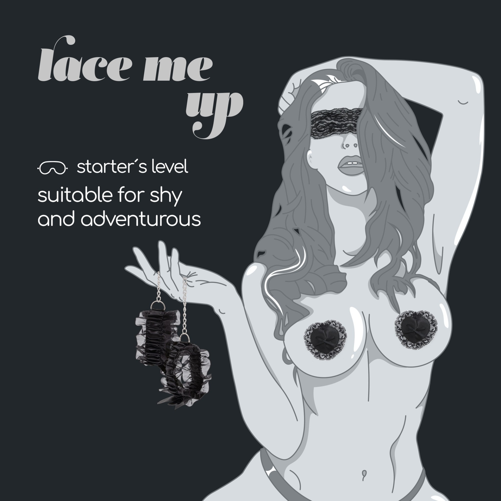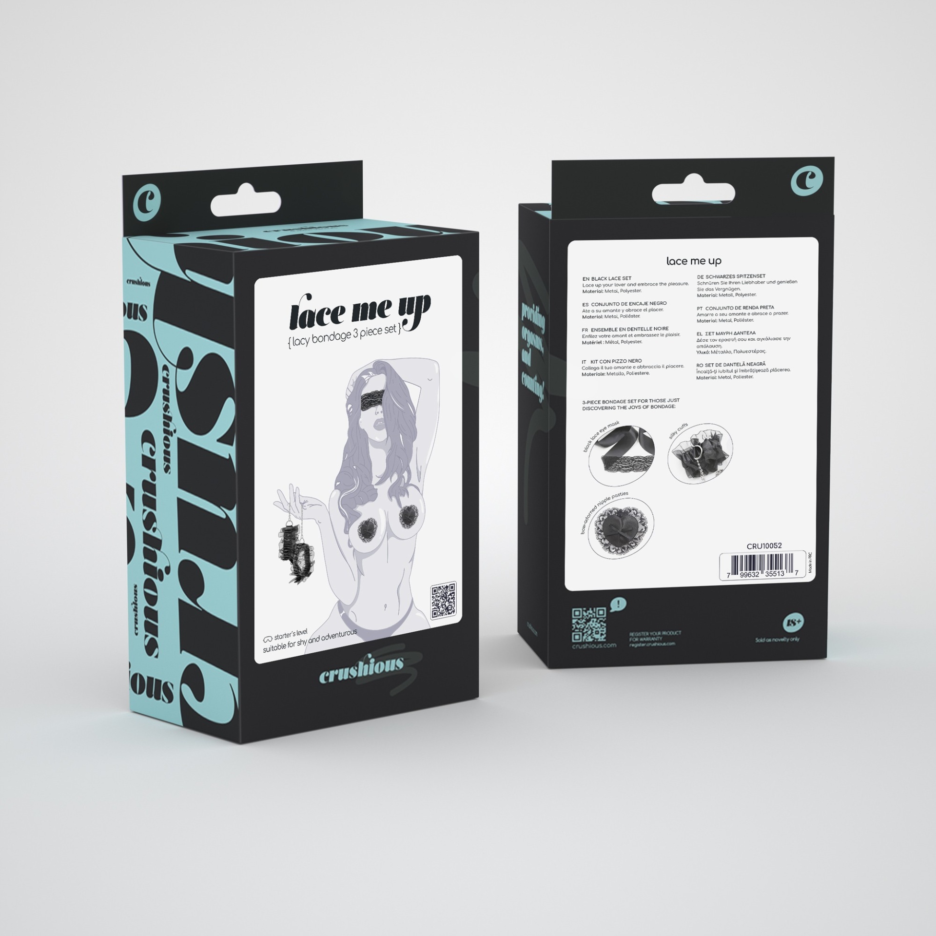 As carícias rendadas deste magnífico conjunto bondage vão induzir a um jogo romântico e excêntrico. Características principais:· Conjunto de renda Bondage de 3 peças· Adequado para principiantes e utilizadores experientes· Tapa mamilos reutilizáveis· Venda de renda ajustável· Algemas elásticas· Material: Metal, Poliéster