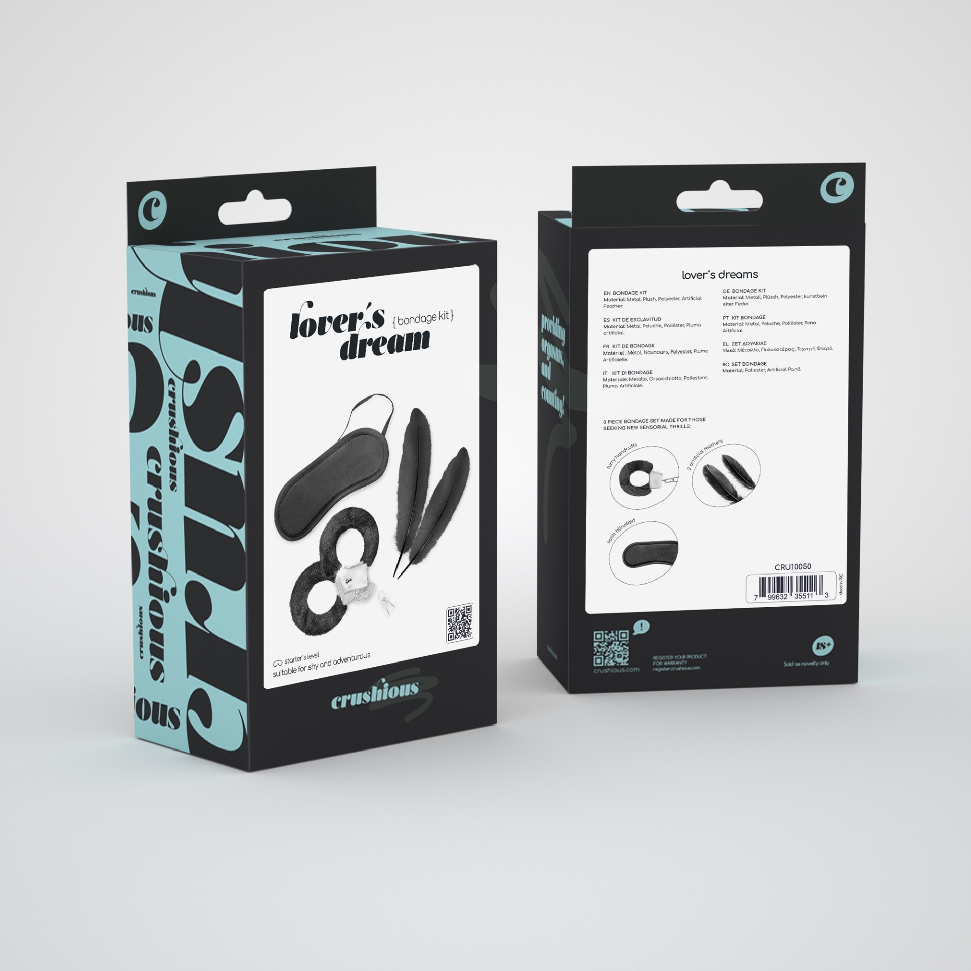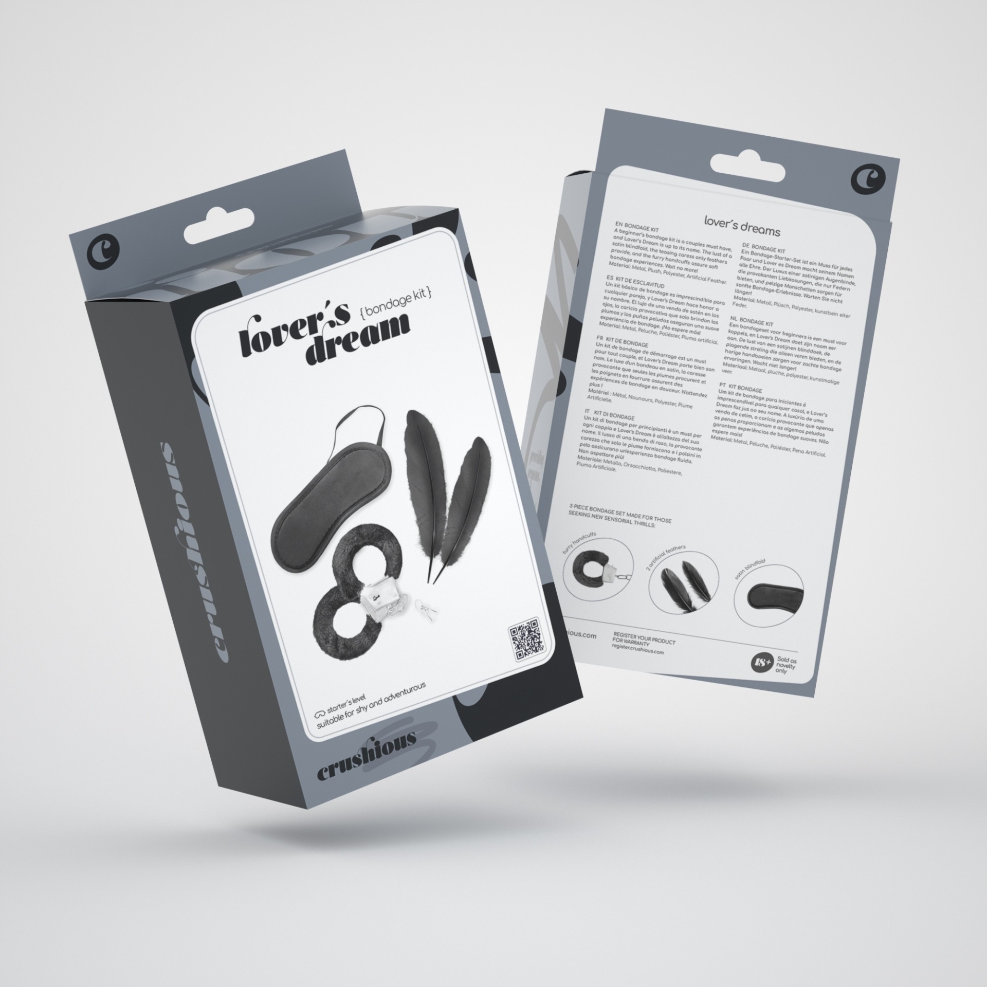 A luxúria de uma venda de cetim, a carícia provocante que apenas as penas proporcionam e as algemas peludas garantem experiências de bondage suaves. Não espere mais! Características principais:· Conjunto bondage de 4 peças para principiantes· Inclui algemas, penas e venda· Algemas de peluche de abertura rápida ajustáveis· 2 penas· Venda de cetim· Material: Metal, Peluche, Poliéster, Pena artificial