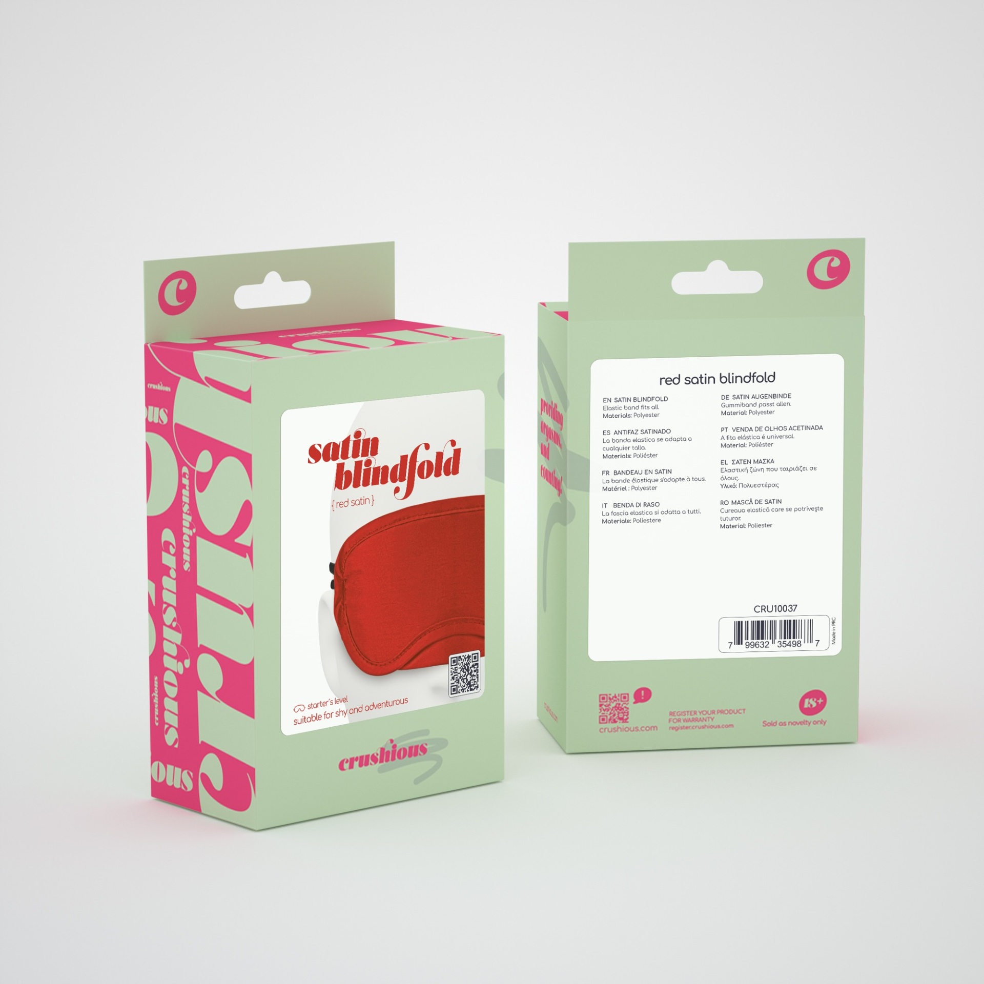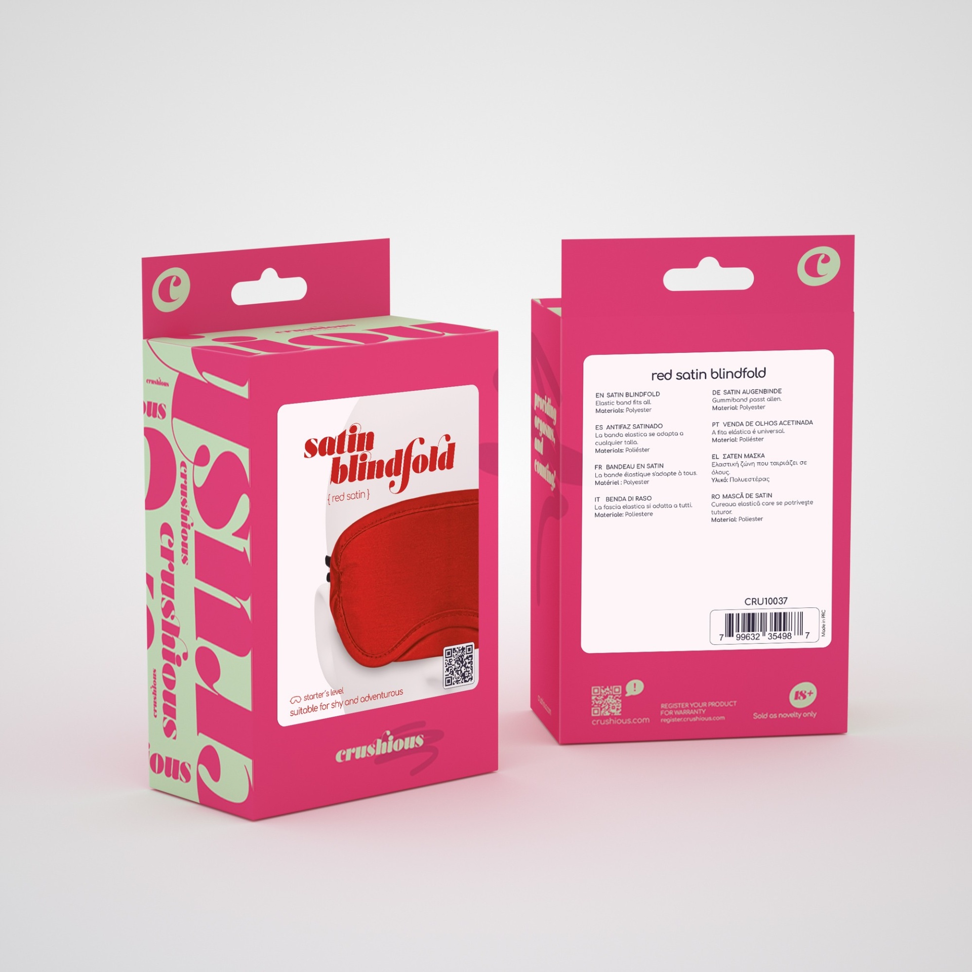 Máscara de cetim vermelha em embalagem rosa e branca com texto Satin blindfold