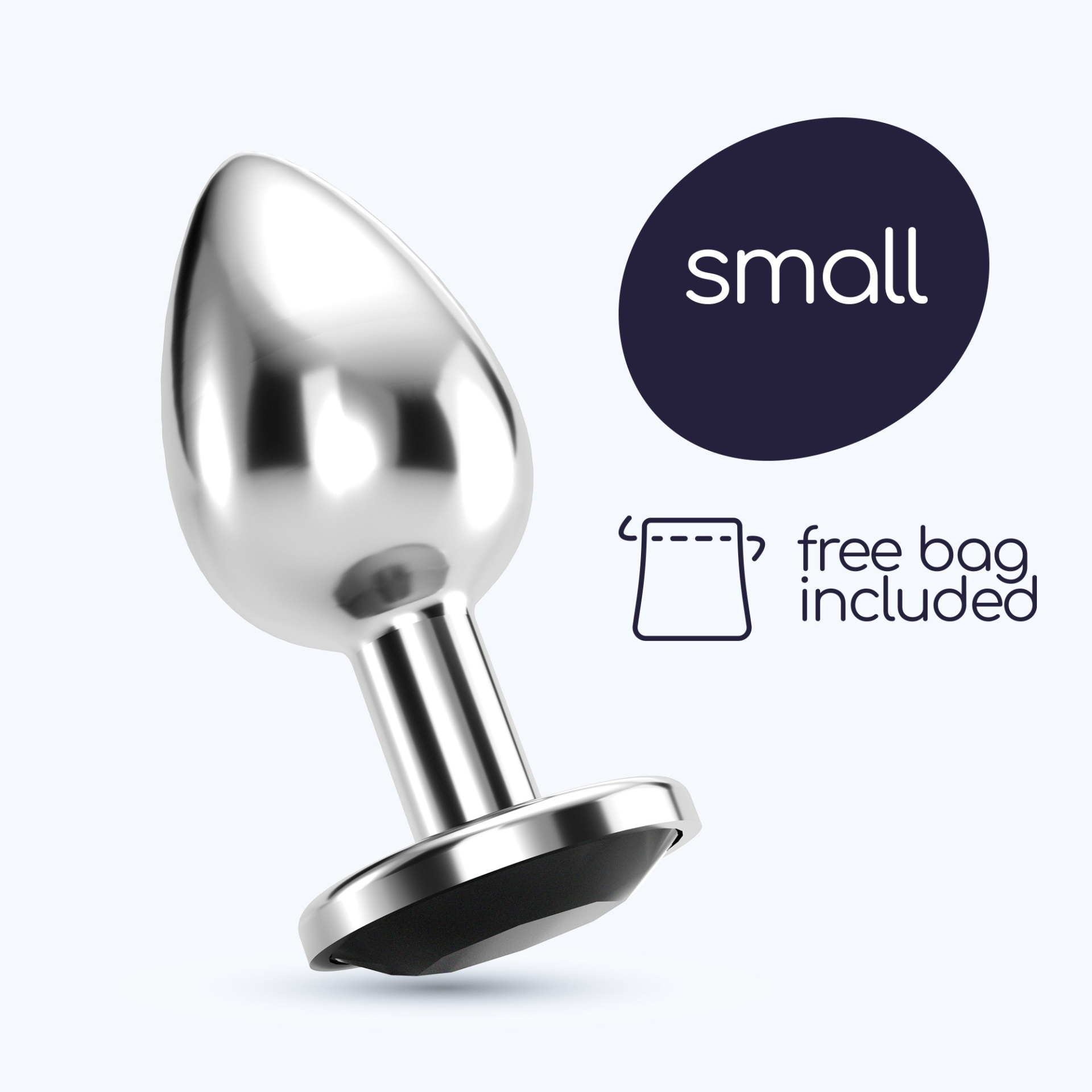 Plug anal metálico pequeno com base preta e indicação de saco grátis