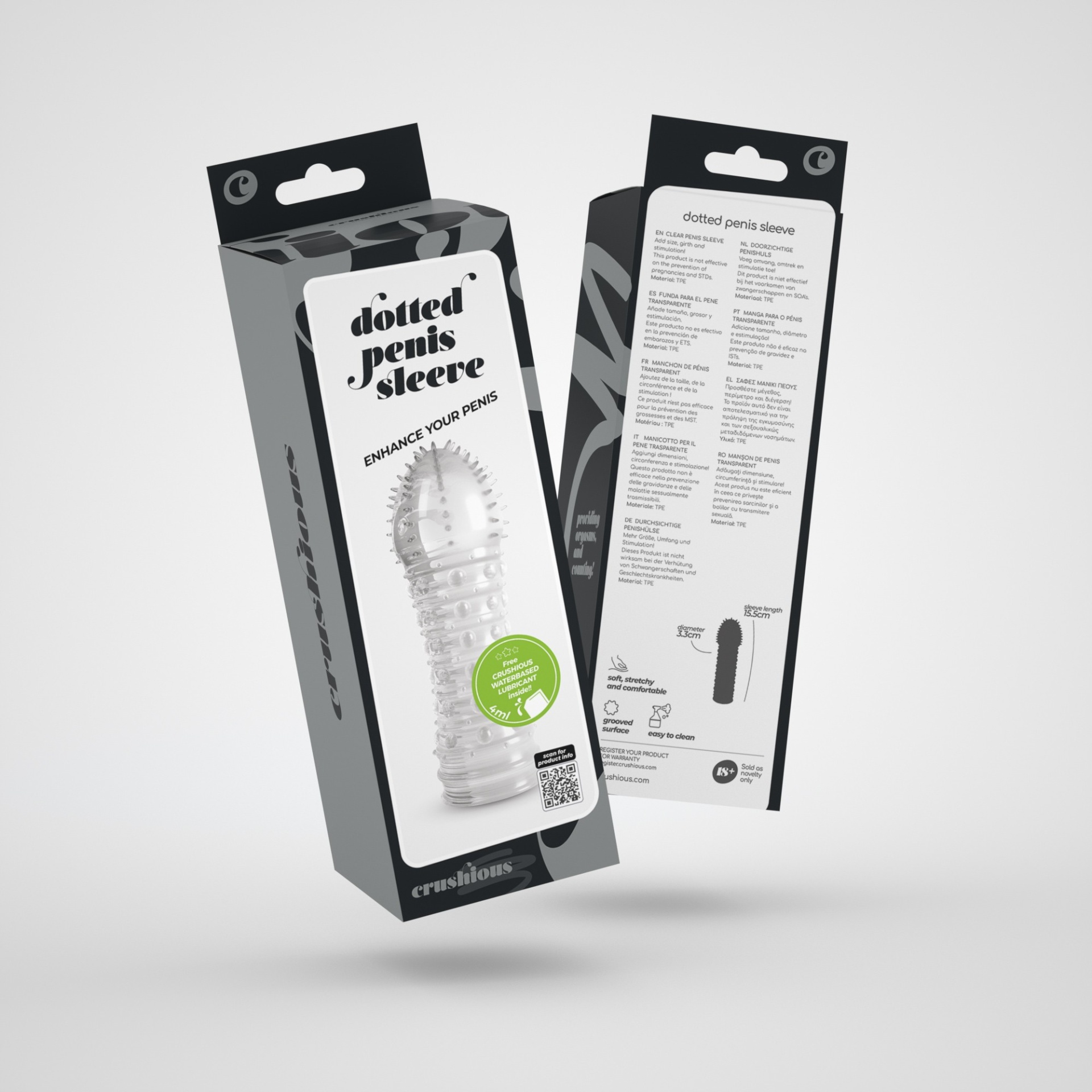Sonha em aumentar a espessura do seu pénis e estimular ainda mais o seu par? A manga Dotted torna isso possível! Feita em suave e bastante elástico TPE, torna-se quase uma segunda pele do seu membro, dotando-o de um super pénis criado para dar prazer.A glande é preenchida com fileiras desenhadas para estimular e provocar a cada investida, o corpo está composto por protuberantes círculos que farão o seu par delirar.Use com lubrificante de base água para melhor inserção. Escolha os lubrificantes Crushious na versão Waterbased para ainda melhores resultados.Lave a sua manga com água morna e sabão neutro após o uso, pode também utilizar um detergente antibacteriano específico para brinquedos.Inclui uma saqueta de lubrificante grátis!Nota:Este produto não é eficaz na prevenção de gravidez e transmissão de ISTs.Dimensões:Comprimento: 15,5cm;Diâmetro: 3,3cm.