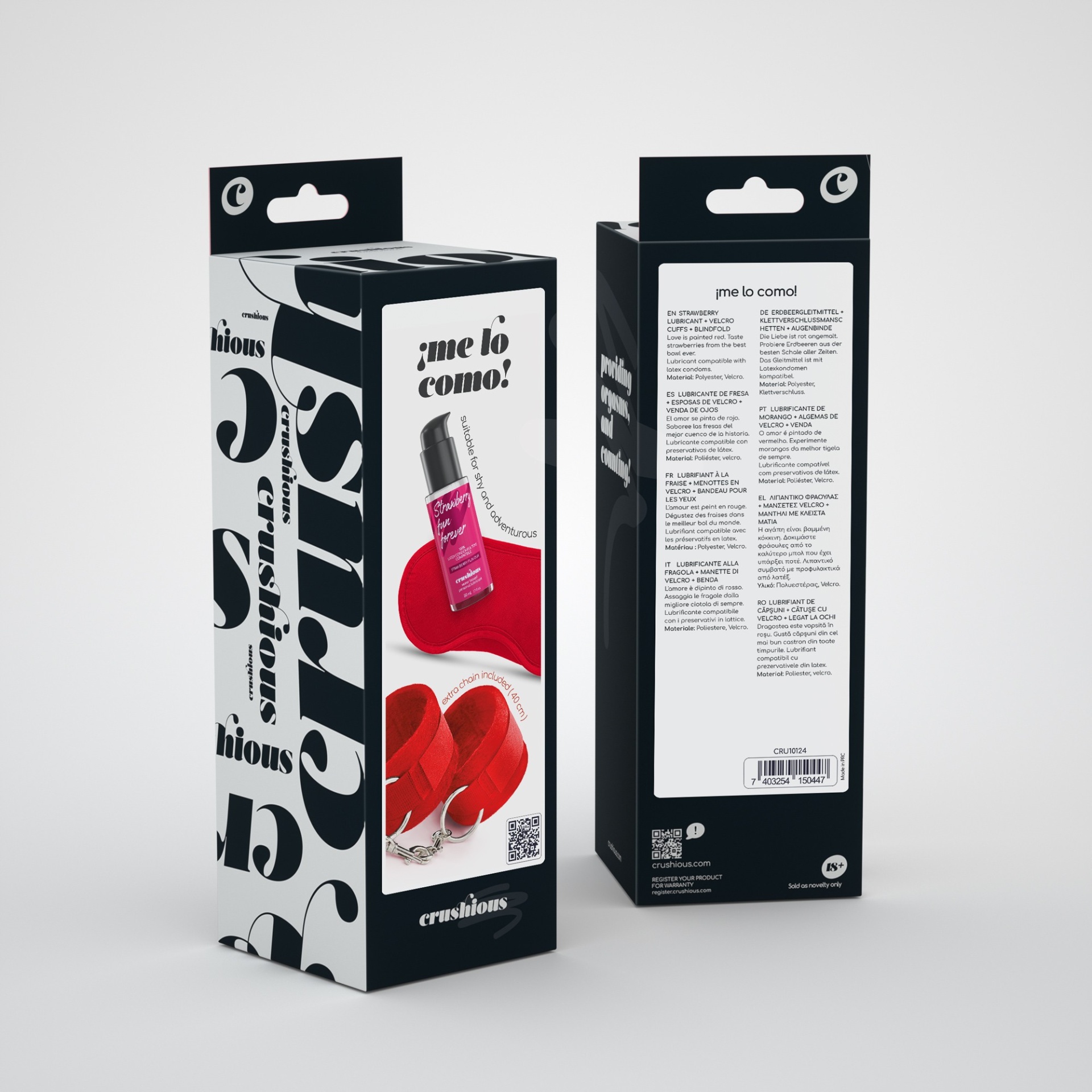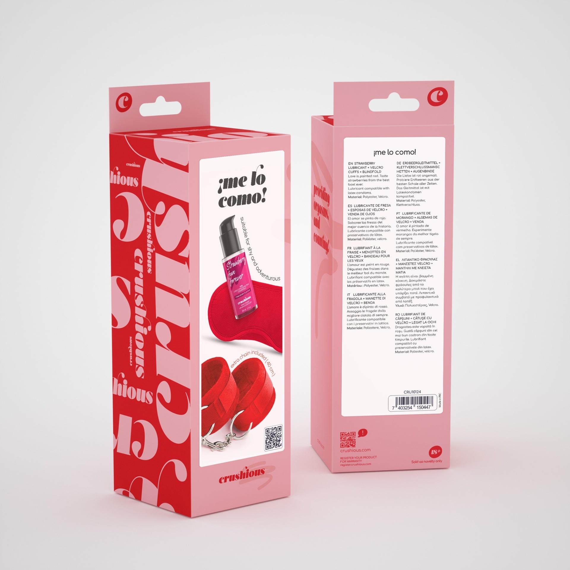Sabe aquele petisco que sabe sempre bem? Dê a provar todo o seu amor com gostinho a morango.Avise o seu par que quer jogar um jogo enquanto lhe coloca a delicada venda, certifique-se que não vê nada e ponha as algemas nos pulsos da sua presa e besunte-a com o incrível e inebriante lubrificante com aroma de morango. Massaje, deslize, lamba e beija sem culpa!O lubrificante é de muito baixo indíce glicémico, tornando-se a opção ideal para todos.Tem o tamanho perfeito para o acompanhar em viagem é de uso muito prático e sem desperdício. A bomba gota a gota garante a dosagem perfeita em cada utilização. Compatível com preservativos de látex e todo o tipo de brinquedos.Atencão:As reações alérgicas não são comuns, mas podem ocorrer. Antes de usar o lubrificante de forma regular, aplique uma pequena quantidade no seu antebraço. Caso surja uma reação alérgica, suspenda o uso.Mantenha fora do alcance das crianças.Não use em pele irritada ou ferida.Quantidade:50 ml.As versáteis algemas são ajustáveis e permitem o uso da sua ilimitada imaginação.A venda com dois elásticos bloqueia perfeitamente a luz.