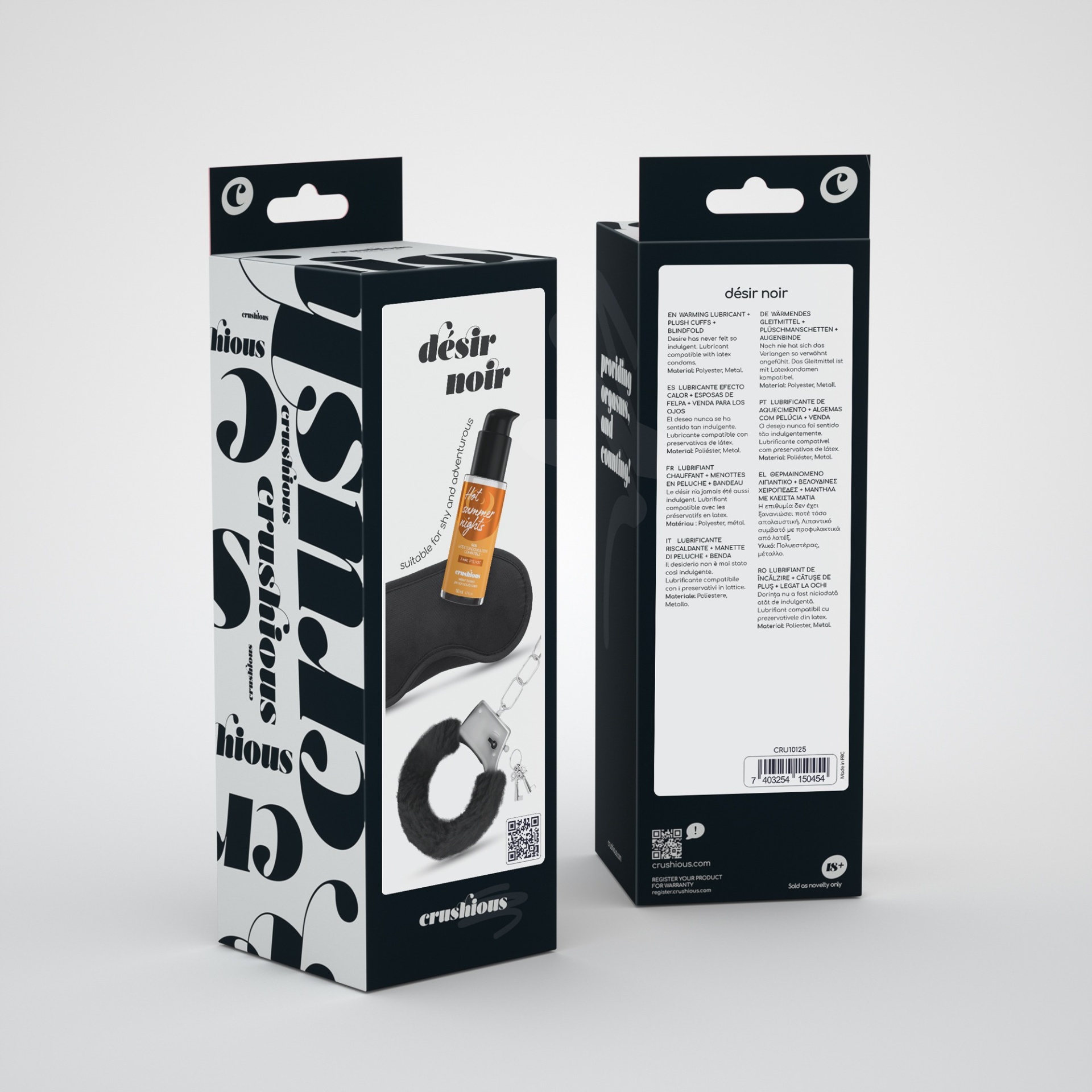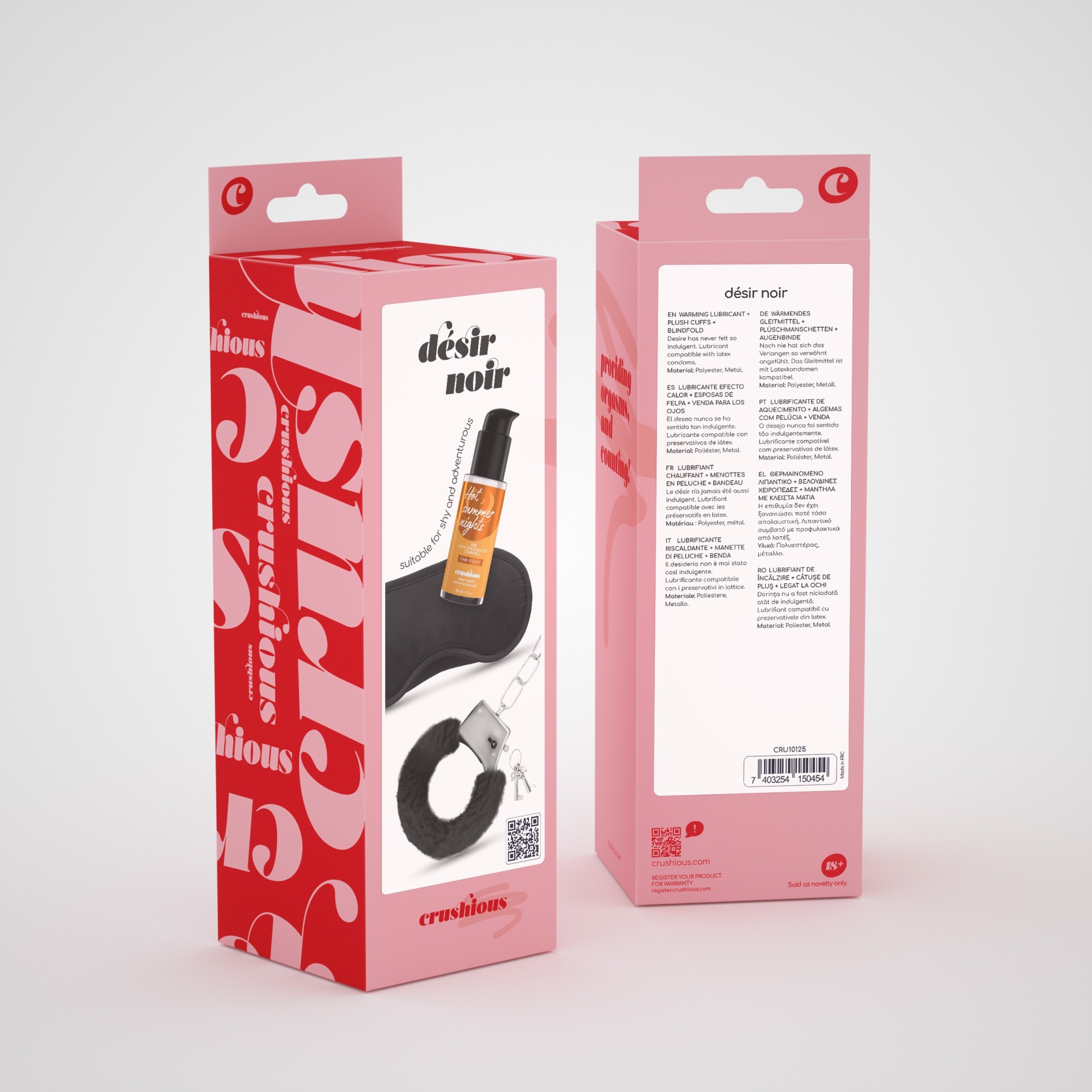Momentos a dois ainda mais escaldantes? Désir Noir foi feito a pensar nisso mesmo.Entre no excitante mundo do soft bondage com as algemas de pelúcia Love Cuffs. Possuem abertura de segurança e duas chaves para poder brincar sem medos.Vende o seu parceiro e peça para adivinhar onde irá sentir o efeito de aquecimento do lubrificante Crushious.Tem o tamanho perfeito para o acompanhar em viagem, é de uso muito prático e sem desperdício. A bomba gota a gota garante a dosagem perfeita em cada utilização. Compatível com preservativos de látex e todo o tipo de brinquedos.Atencão:As reações alérgicas não são comuns, mas podem ocorrer. Antes de usar o lubrificante de forma regular, aplique uma pequena quantidade no seu antebraço. Caso surja uma reação alérgica, suspenda o uso.Mantenha fora do alcance das crianças.Não use em pele irritada ou ferida.Quantidade:50 ml.As fofas algemas são perfeitas para principiantes e a venda com dois elásticos bloqueia perfeitamente a luz.