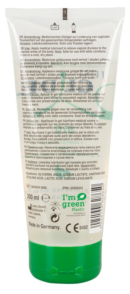 INGREDIENTES:Glicerina, Água, Lactato de Sódio, Goma de Xantana, Ácido Levulínico, Ácido láctico, Levulinato de sódio.DESCRIÇÃO:O JUST GLIDE bio é um lubrificante orgânico natural à base de água num tubo de PE ecológico e \'Verde\', feito a partir da cana-de-açúcar de recurso renovável que liga CO2 durante o crescimento de uma forma amiga do ambiente. A fórmula inodora e inodora é 100% vegana e segura para usar com preservativos de látex. O lubrificante é isento de óleo e gordura para que possa ser lavado sem deixar nenhuma mancha.USO RECOMENDADO:Aplique a quantidade que desejar sobre qualquer parte do corpo.PRECAUÇÕES:- Guardar em local seco e fresco.QUANTIDADE: 200ml.