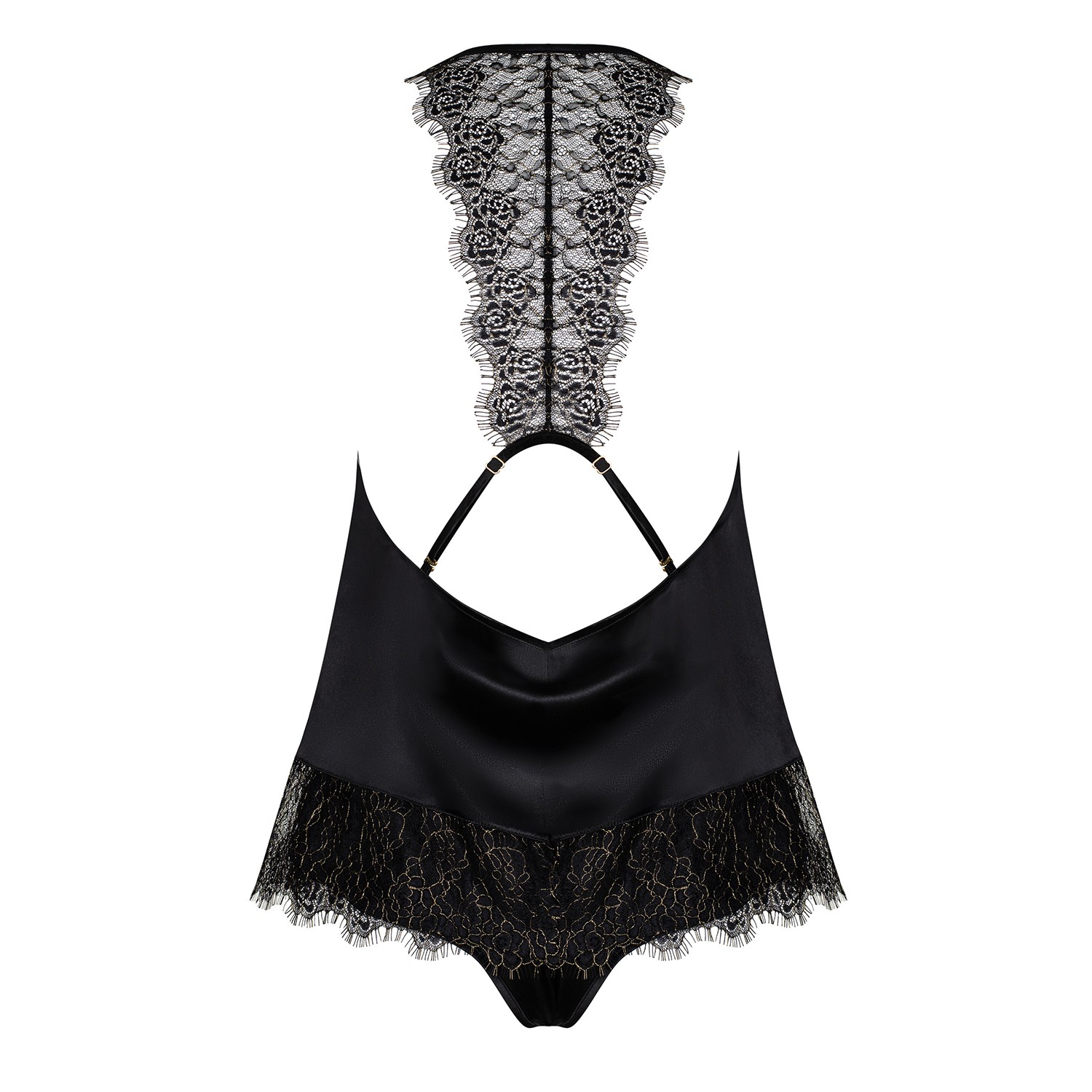 Momentos cheios de prazer são algo que encontrará no conjunto Agatya! O cetim preto intrigante no qual se derreterá com prazer fará lembrar as noites que passou com o seu amado com um blush no rosto.Mais detalhes importantes:- no conjunto: top e cueca de Agatya- busto único com decote realçado- alças ajustáveis na parte do sutiã e nas costas - conforto vestido- decoração em renda nas costas - aspeto espantoso!- costas expostas - corte intrigante- top e shorties acabados com renda- cueca com um corte feminino - pernas e traseiro realçados- material agradável ao toque, prazeroso (90% poliamida, 10% elastano)
