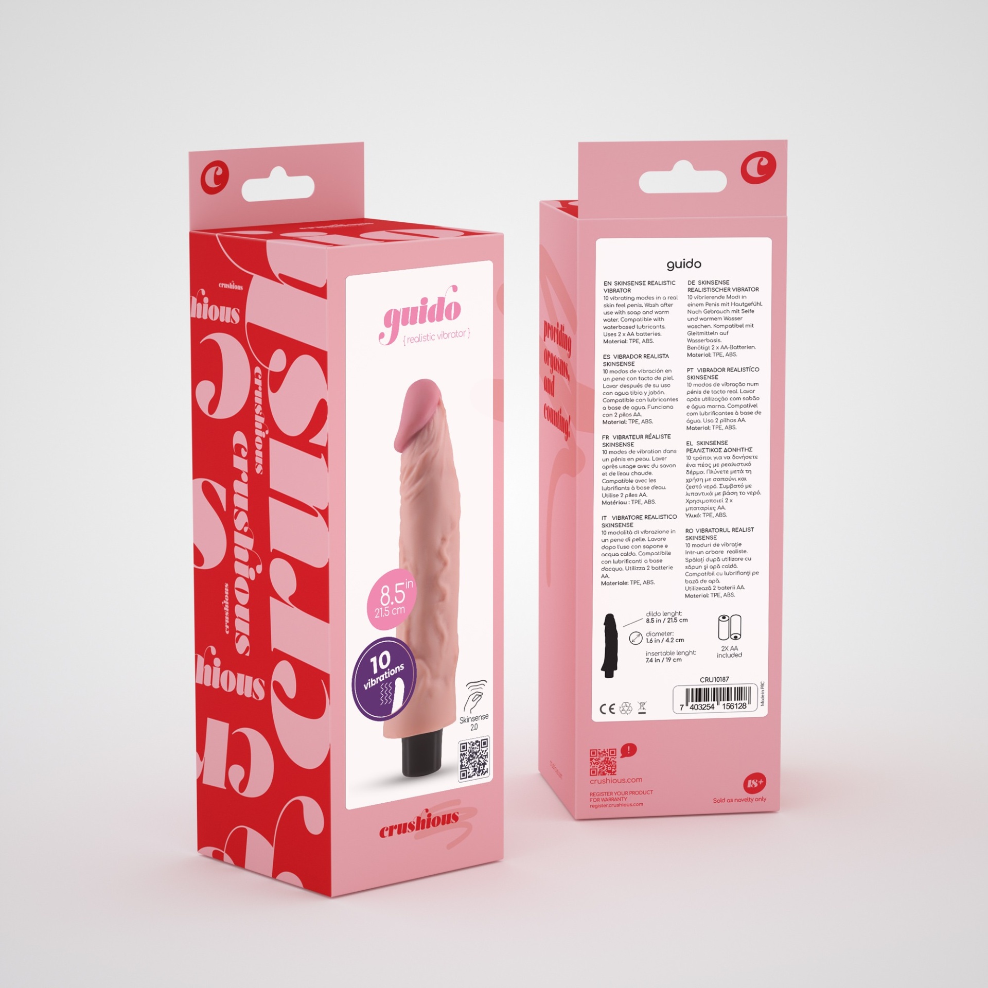 Guido é aquele amante latino que a fará reviver aqueles dias passados na Toscana para o resto da sua vida. Guido foi projetado para momentos intensos e penetrações profundas. A glande protuberante e as veias salientes permitem experiências imensamente realistas. Os seus 10 modos de vibração são facilmente intercambiáveis ao premir o botão na base. Guido é à prova de água, sendo uma companhia perfeita em duches especiais. Use o seu Guido com lubrificantes Crushious e desfrute do seu brinquedo no seu melhor. Este vibrador funciona com 2 pilhas tipo AA, que lhe são fornecidas para usar o seu Guido assim que o compre! O Guido é livre de ftalatos e é bastante fácil de limpar. Retire as pilhas, feche bem a tampa e lave-o com água morna e sabão neutro. Use um spray antibacteriano de vez em quando. Seque-o ao ar e guarde-o numa bolsa de tecido, afastado dos outros brinquedos e longe da luz solar direta e de fontes de calor. Polvilhe-o com pó de talco para ajudar a manter as suas propriedades elásticas. Retire sempre as pilhas quando não estiver a ser utilizado. Material: TPE, ABS. Dimensões: Inserível:19 cm de comprimento; 4,2 cm de diâmetro. Total 21,5 cm de comprimento; 4,2 cm de diâmetro.