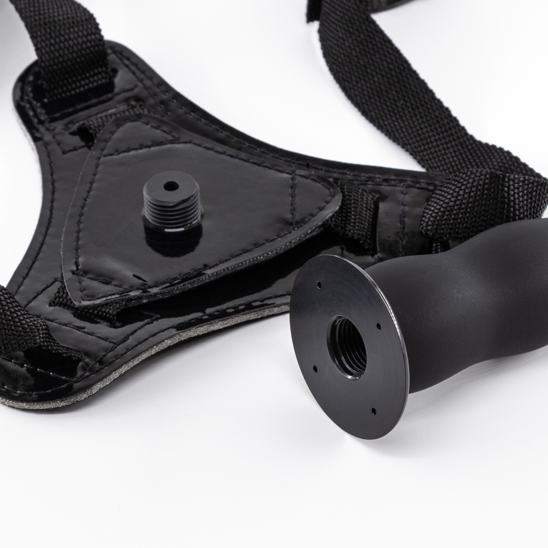 Arnês preto com dildo preto em manequim branco