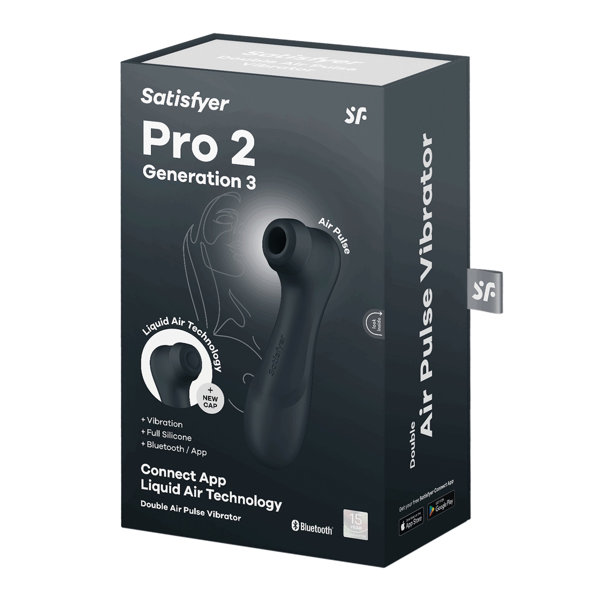 Caixa do vibrador Satisfyer Pro 2 Generation 3 preto com texto branco e fundo cinzento