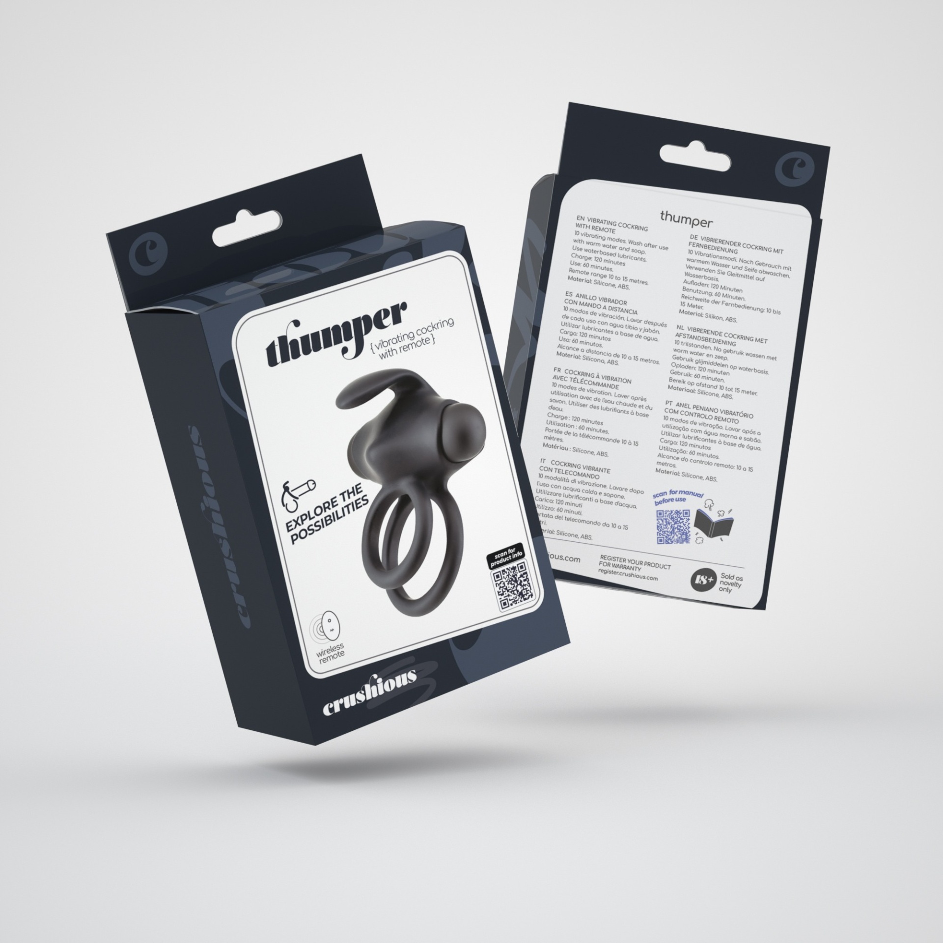 Batidas a caminho de pleasureville! O Thumper oferece 10 modos de vibração potentes enquanto agarra o pénis e os testículos como sempre quis.Com um toque suave e aveludado, esta bala e o anel são feitos de silicone seguro para o corpo, que não agride a pele, é inofensivo para o corpo humano e não contém ftalatos.Thumper é totalmente à prova de água, tornando-se o companheiro perfeito para o duche e o banho.Esta bala é para uso externo, não a utilize para uso anal.Tanto a bala como o controlo remoto estão equipados com uma bateria recarregável de iões de lítio que dura até 60 minutos de diversão com o cabo de carregamento USB incluído.Carregamento: 120 minutosUtilização: até 60 minutosPremir o botão da bala durante 2 segundos para ligar e desligar. Prima ligeiramente o botão para alternar entre modos.Utilização com controlo remoto:- Ligue a sua bala.- Prima o botão Ligar/Desligar no telecomando.- Prima novamente para ativar e alternar entre os 10 modos.- Pressionar prolongadamente o botão Ligar/Desligar para desligar.A limpeza é muito fácil, basta lavar com água morna e sabão neutro ou utilizar um spray de limpeza para brinquedos. Utilize um spray de limpeza antibacteriano para obter melhores resultados. Secar e guardar ao abrigo da luz e de fontes de calor.Aconselha-se a utilização de lubrificante. Utilize sempre lubrificantes à base de água. Os óleos e outros tipos de lubrificantes danificam a integridade do material.Os lubrificantes Crushious são o melhor complemento para os seus brinquedos Crushious.Consultar o manual de instruções antes da utilização.Dimensões:8,5 cm de comprimento; diâmetro expansível.Bala com 7,5 cm de comprimento.Material:Silicone, ABS