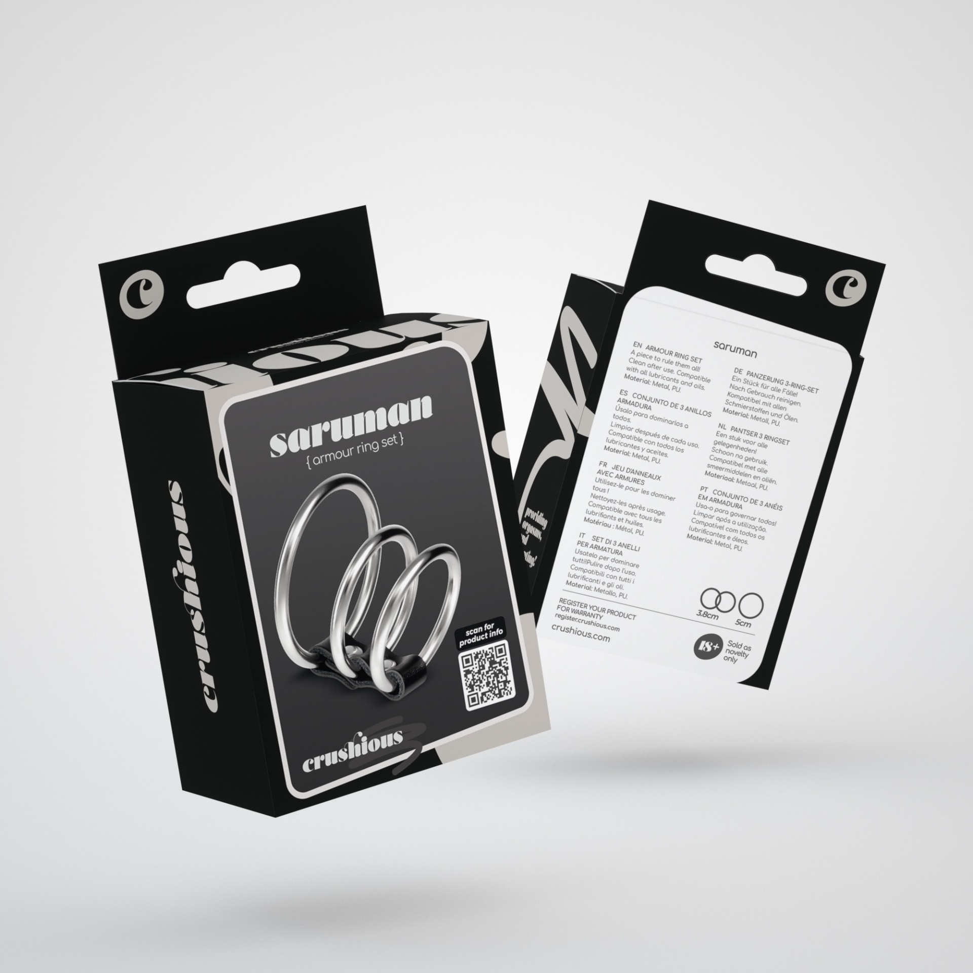 Procura um brinquedo versátil e resistente? Saruman é o anel supremo!Um conjunto de 3 anéis que pode ser usado para agarrar o seu membro.1 brinquedo, um mundo de sensações.Quer aumentar ainda mais o seu prazer? Utilize o metal para brincar com a temperatura, coloque os anéis durante alguns minutos em água fria ou quente antes de os utilizar.Cuidado para não utilizar os anéis durante longos períodos de tempo.A limpeza é super fácil, lave com água morna e sabão neutro ou utilize um spray de limpeza de brinquedos. Utilize um spray de limpeza antibacteriano para obter melhores resultados. Secar e guardar ao abrigo da luz e de fontes de calor.Aconselha-se a utilização de lubrificante. Utilize sempre lubrificantes à base de água. Os óleos e outros tipos de lubrificantes podem danificar a integridade do material.Os lubrificantes Crushious são o melhor complemento para os seus brinquedos Crushious.Dimensões:Diâmetro: 3,8 cm; 5 cm.Material:Metal, PU.