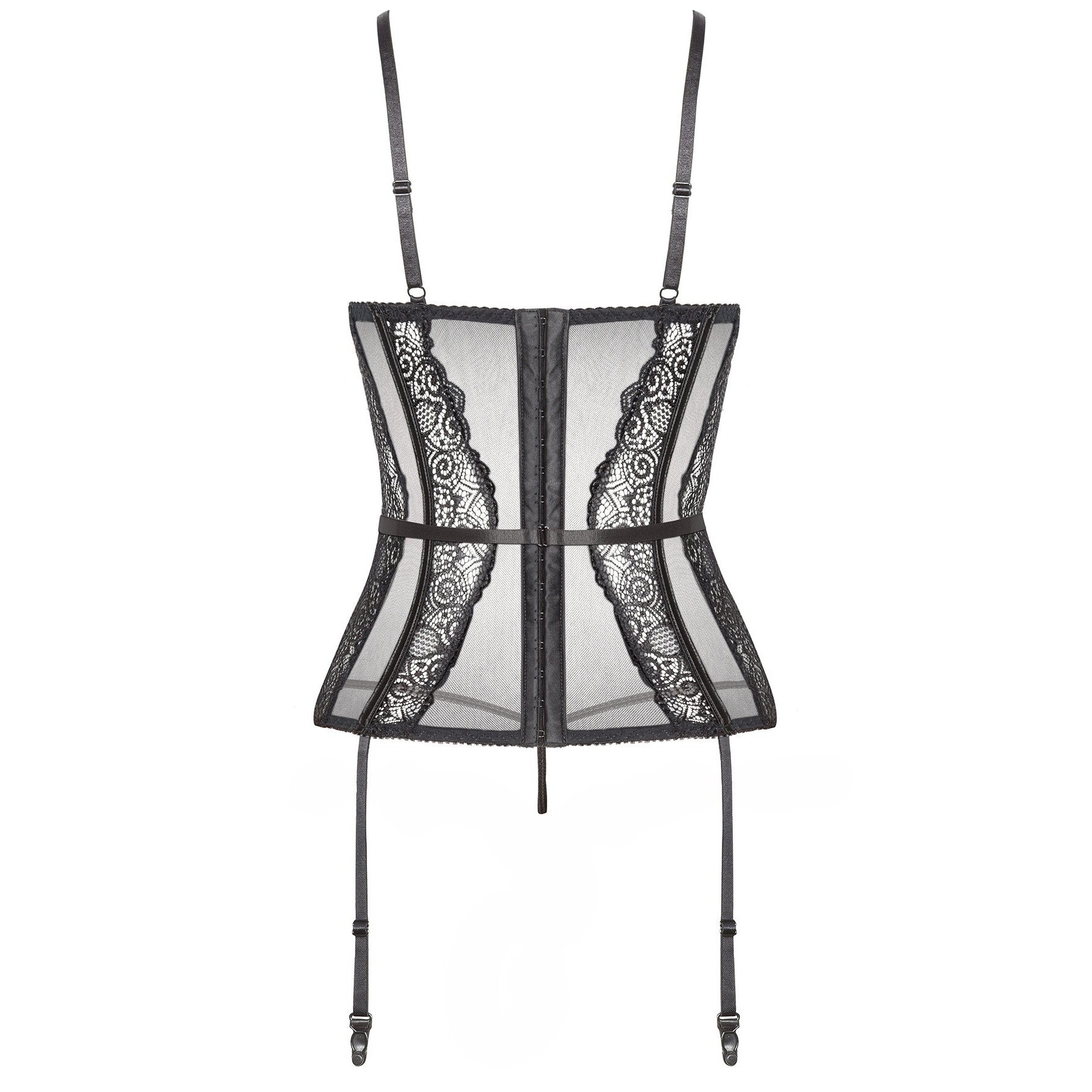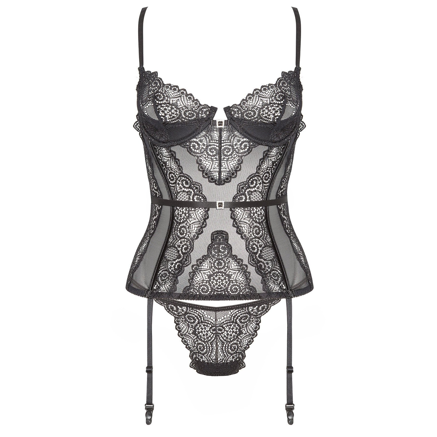 Torne a sua noite inesquecível com o corpete de renda Ravenna em preto. Feito de renda preta e tule, este corpete sensual acentua a silhueta feminina, acrescentando um toque de elegância e sex appeal. Perfeito para ocasiões especiais ou noites românticas a dois.Design: A Tanga combina na perfeição com o corpete, criando um conjunto harmonioso. As copas com acolchoamento, proporcionam um excelente suporte e forma para o busto. Com fecho nas costas permite colocar e retirar facilmente o corpete. As rendas delicadas acentuam as curvas femininas e conferem sensualidade.Embalagem: Caixa elegante com a imagem de apresentação do produto, marcada pelo holograma do logótipo Beauty Night Fashion.Tamanhos: S/M e L/XL.S/M: (Seios: 81-91 cm, B-C, Cintura: 56-71 cm, Anca: 85-97 cm).L/XL: (Seios: 91-107 cm, C-D, Cintura: 71-91 cm, Anca: 97-112 cm).Material: 88% Poliéster, 12% Elastano.