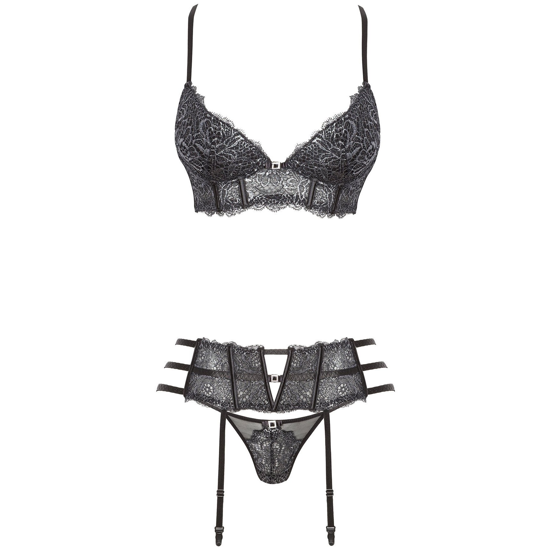 Um conjunto de três peças composto por um sutiã, cinto de ligas e tanga. A parte da frente é feita de uma bonita renda com um brilho metálico prateado, enquanto a parte de trás é feita de uma delicada malha. Copas push-up com aros curtos por baixo. O conjunto é adornado com três bonitos broches com cristais.Detalhes do produto:Componentes do conjunto: Sutiã, cinto de ligas e tanga.Design frontal: Feito de renda deslumbrante com um brilho metálico prateado.Design das costas: Feitas de malha delicada.Soutien: Copas push-up com aros curtos por baixo.Adornos: Decorado com três bonitos broches de cristal.Caraterísticas adicionais:Ocasião: Perfeito para ocasiões especiais, noites românticas ou quando se quer sentir especial.Este conjunto Ileen combina elegância e sensualidade, concebido para a fazer sentir irresistivelmente atraente.Conjunto na elegante embalagem com a imagem de apresentação do produto, marcada com o holograma do logótipo Beauty Night Fashion. Bolsa para guardar ou lavar roupa incluídaTamanho: S/M e L/XLTamanho S/M: (Peitos: 81-91 cm, B-C, Cintura: 56-71 cm, Anca: 85-97 cm) Tamanho L/XL: (Peitos: 91-107 cm, C-D, Cintura: 71-91 cm, Anca: 97-112 cm)Material: 88% Poliéster, 12% Elastano