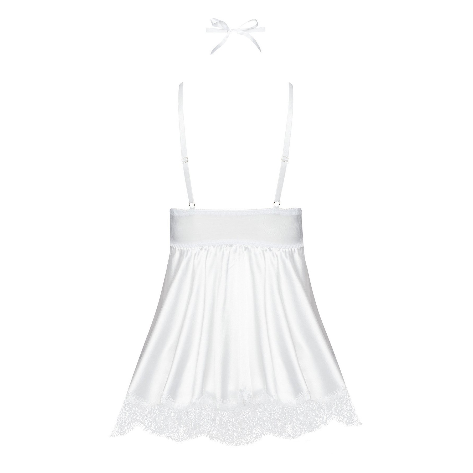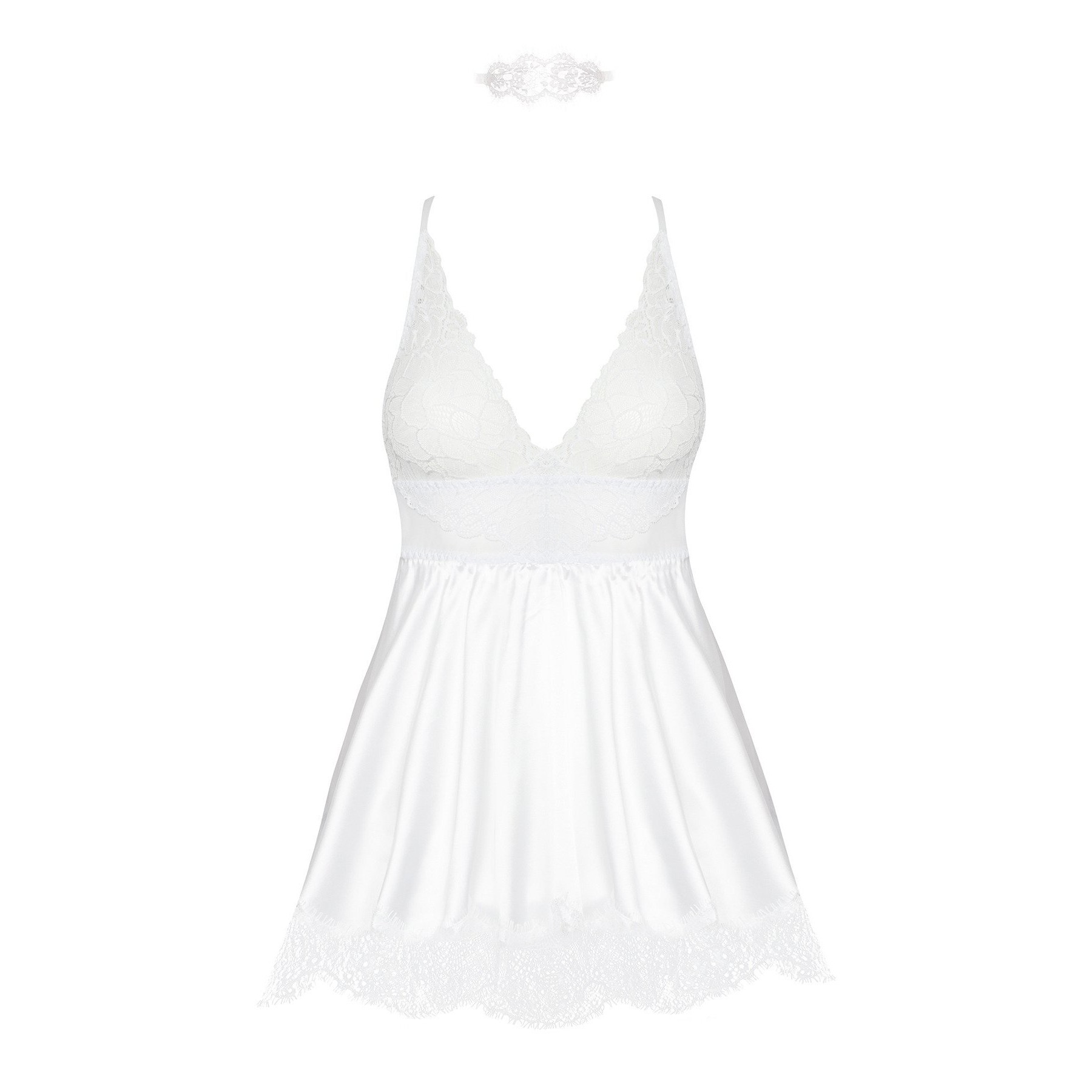 A camisa de noite Eve com máscara num tom branco radiante é uma peça de lingerie luxuosa que combina elegância com um toque de mistério. Este conjunto inclui uma camisa de noite sedutora, uma tanga a condizer e uma máscara de renda, perfeita para um visual encantador e sedutor.O conjunto inclui: Uma camisa de noite, uma tanga e uma máscara de renda a condizer.Detalhes da camisa de noite:Cor da camisa de noite e da tanga: branco brilhante e luxuoso.Material: Feito de cetim e renda de alta qualidade, oferecendo uma sensação suave e macia contra a pele.Design: A camisa de noite apresenta copas de renda preta intrincada com padrões florais, proporcionando um toque delicado e feminino. As copas foram concebidas para realçar e apoiar o busto. O corpo acetinado da camisa de noite flui graciosamente, terminando num remate de renda recortada que confere um acabamento sofisticado. As inserções de renda transparente nos lados e nas costas criam um efeito de espreitadela tentador.Design da tanga: Feita com os mesmos materiais de cetim e renda, proporcionando um visual coeso com a camisa de noite.Design da máscara: A máscara de renda ata-se atrás com fitas de cetim, permitindo um ajuste regulável. O intrincado padrão de renda acrescenta um ar de mistério e fascínio.Ajuste: As alças ajustáveis garantem um ajuste confortável e personalizável. A banda elástica sob o busto proporciona apoio e modelação adicionais. Cai a meio da coxa, tornando-o perfeito para um look sensual e elegante.Embalagem: Apresentado numa elegante embalagem com a fotografia de apresentação do produto, marcada com o holograma do logótipo Beauty Night Fashion.Tamanhos: S/M, L/XL.S/M: (Seios: 81-91 cm, B-C, Cintura: 56-71 cm, Anca: 85-97 cm).L/XL: (Seios: 91-107 cm, C-D, Cintura: 71-91 cm, Anca: 97-112 cm).Material: 88% Poliéster, 12% Elastano.