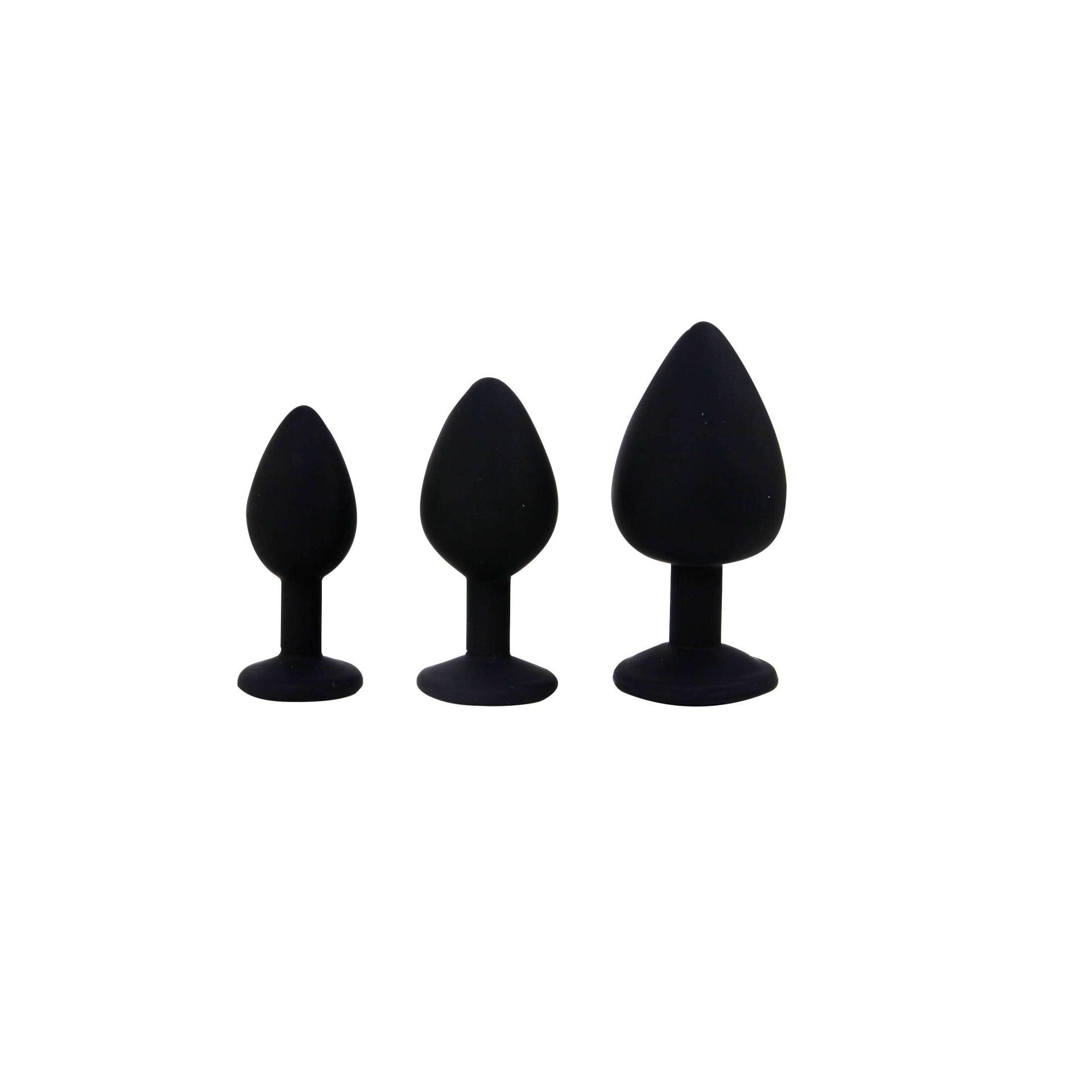 Três plugs anais pretos de silicone em três tamanhos diferentes com base circular.