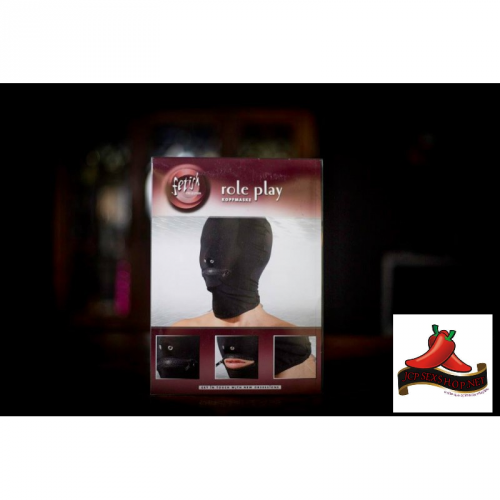 Máscara preta para cabeça com aberturas para olhos e boca na embalagem