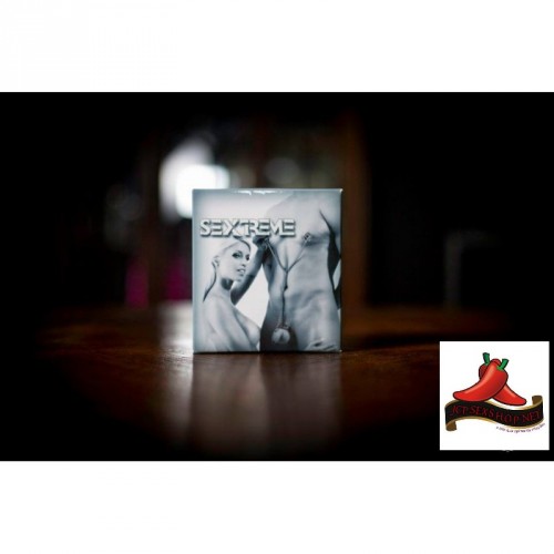 Caixa de perfume ou cosmético com imagem a preto e branco de casal e texto SEXTREME