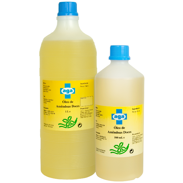 Duas garrafas plásticas amarelas com óleo de amêndoas doces e tampas azuis da marca aga