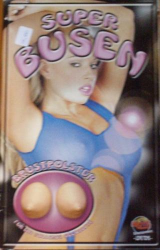 Embalagem de produto com mulher loira de top azul e texto SUPER BUSEN