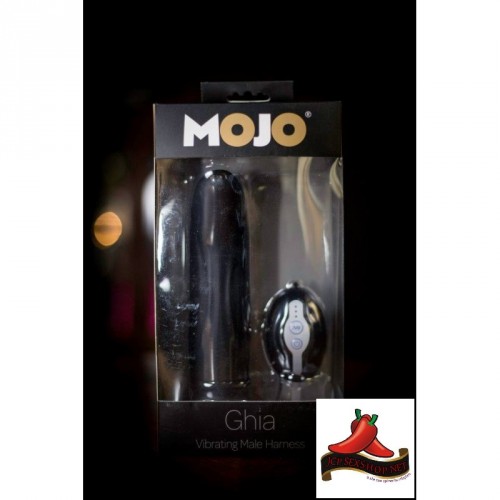 Embalagem do produto MOJO Ghia Vibrating Male Harnes preto com controle