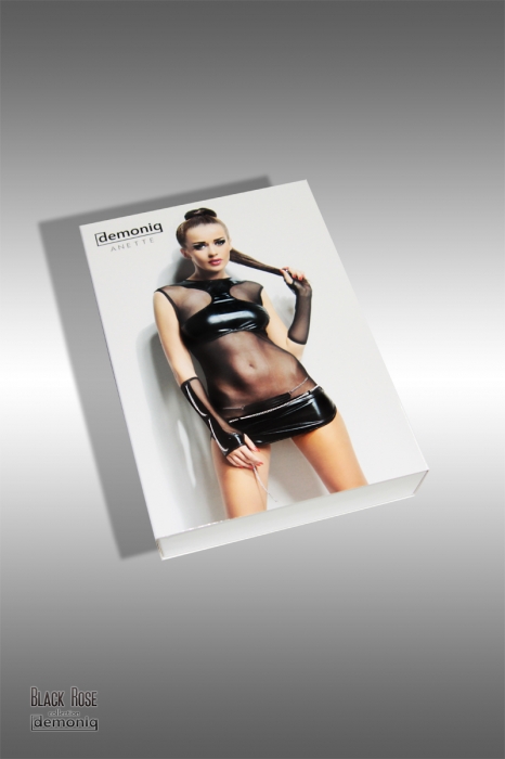 Um vestido com efeito molhado, encaixes de transparência e correntes metálicas. Tem um fecho nas costas e inclui uma tanga e umas luvas a combinar. Tenha um look ainda mais irresistível. Um produto de excelência da marca Demoniq.